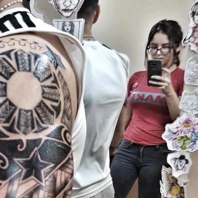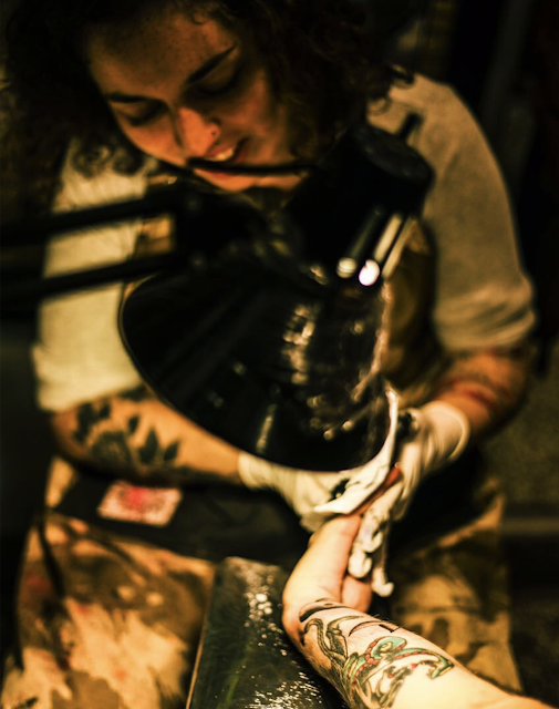 Su primer tatuaje se lo hizo a sí misma, a los 14, hand poked, con tinta y aguja de coser. A los 18 compró su primera máquina de tatuar. Cursó un par de años en la facultad de ingeniería que alternó con los conciertos de metal**y los eventos de tatuajes. De a poco se ganó su derecho de piso en el underground asunceno para transformarse en una dedicada aprendiz de tatuadora. “Muchos de mis clientes son mujeres que se tatúan por primera vez. Aprendí a respetar la expresión de cada uno, no importa si al venir a tatuarse no saben por qué lo hacen, hay algo dentro de ellos que puede adquirir significado después.” Habla de los arquetipos de los diseños y de las mayores posibilidades que ofrece la tecnología. “Tengo que volver a dibujar comics,” se dice a si misma. Su antigua afición por el metal no resta lugar al jazz que acompaña su trabajo. Conversamos sobre la fiesta de la noche anterior, donde tocó Sonido Chuli, la celebrada banda local de cumbia, y Terror Manija, una joven banda punk de mujeres misioneras. Bendito sincretismo paraguayo. “Existe belleza,” señala con misterio y sabiduría.